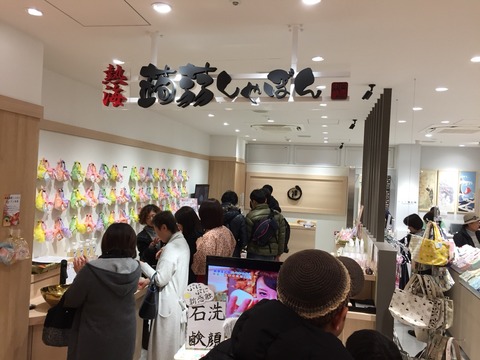 気になったのは、2階にある「熱海蒟蒻しゃぼん」。こんにゃく芋の天然成分を抽出したオーガニック石けんを売ってます。プニッとした感触で、「石」けんと言っていいやら。天然素材ゆえ肌にいい本格派らしく、女子が集まってました。