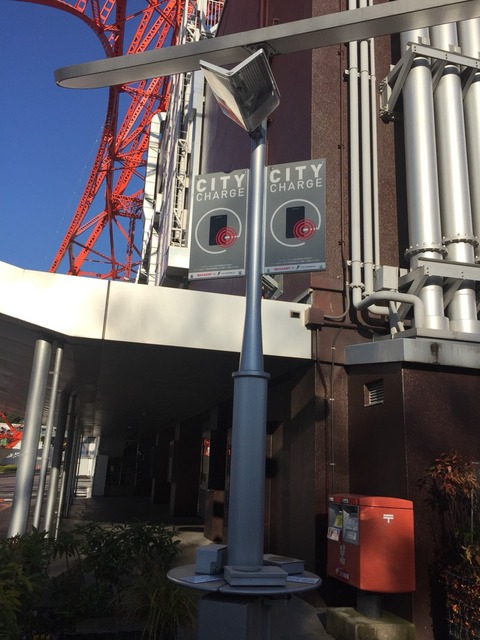 「CITY CHARGE」と書かれたスポットに近づいて見ると、太陽光パネルを活用したエコな充電装置でした。