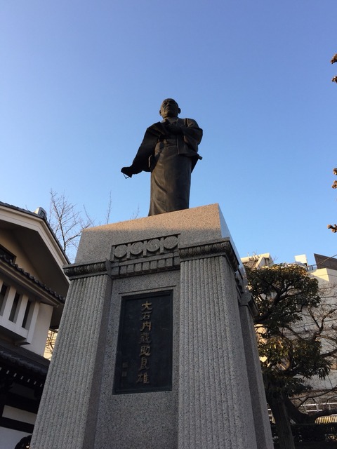 門の脇には、一般的には大石内蔵助(おおいしくらのすけ)として知られる大石良雄の像が建っています。