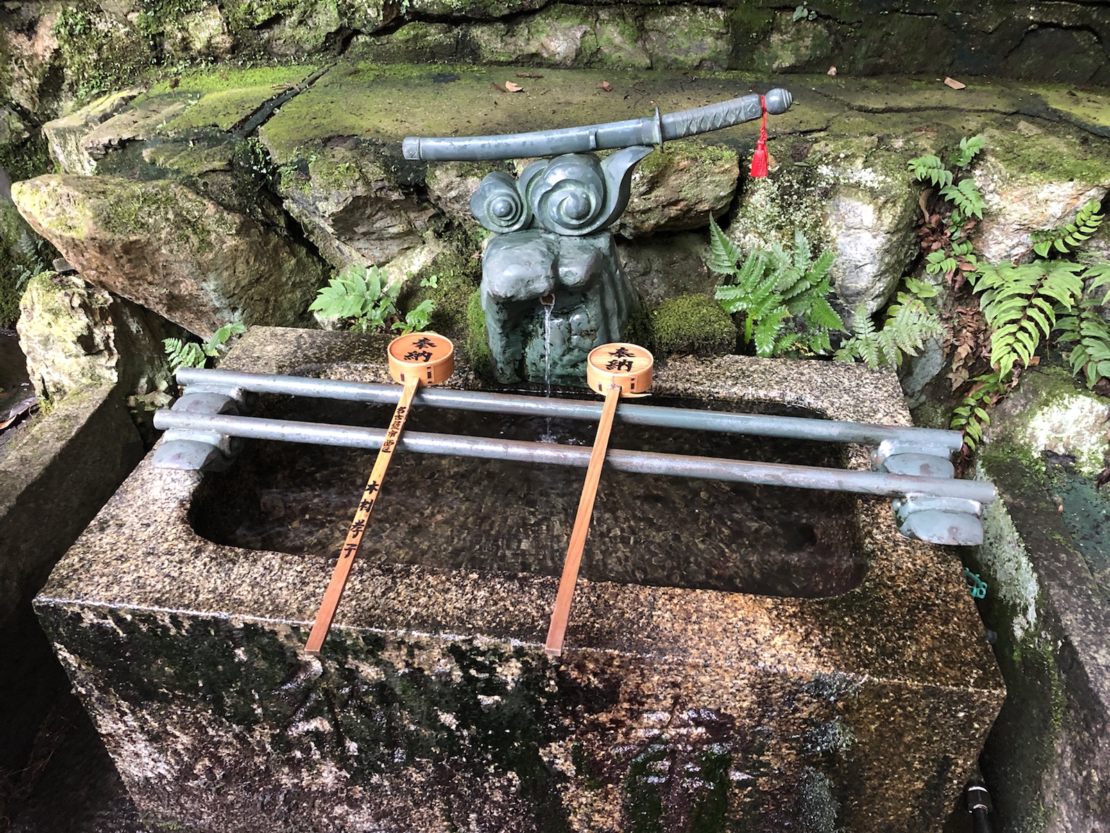 さらに、「御劔社(長者社神蹟)」を詣でます。手水舎が刀の形。
