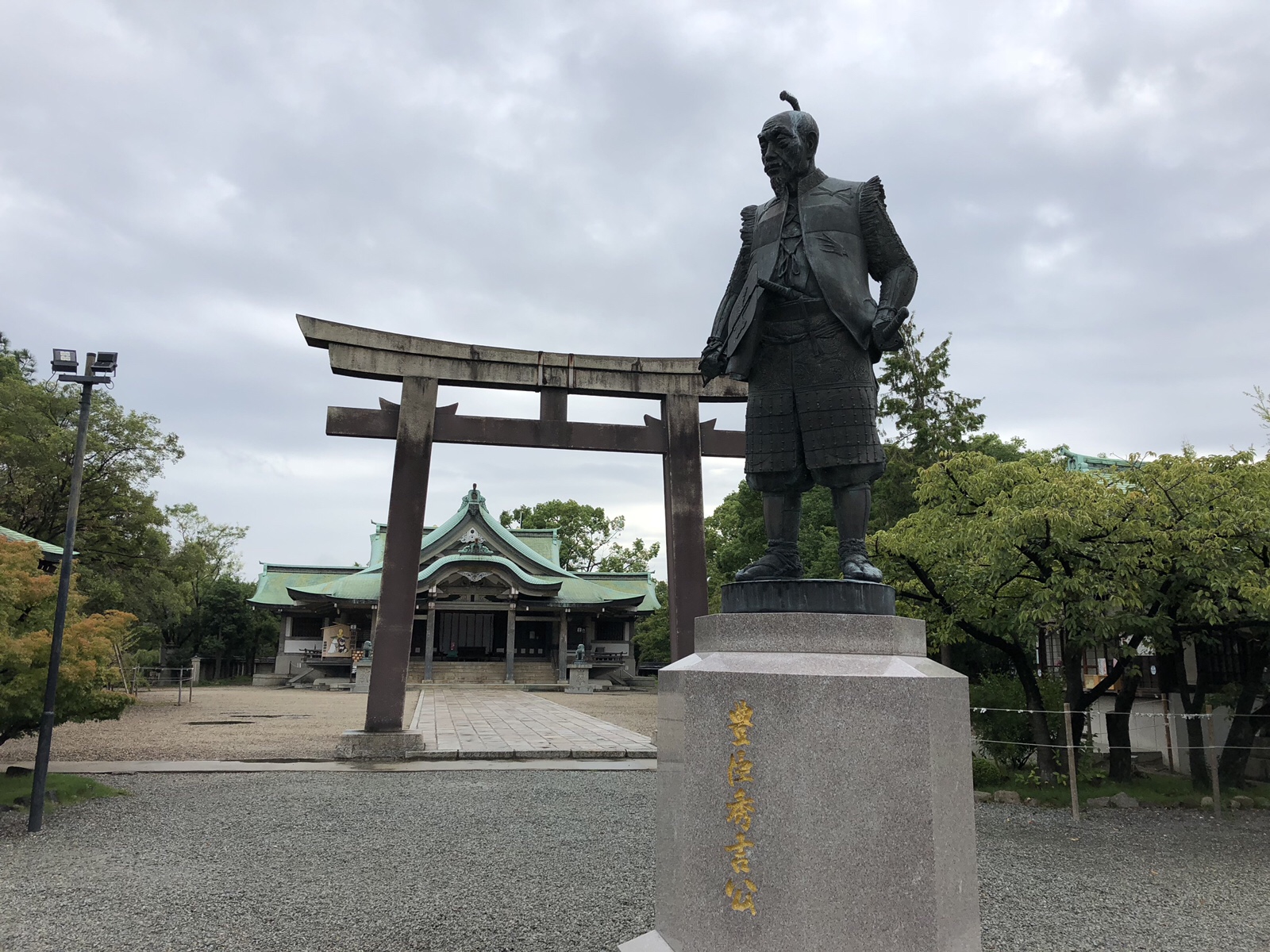 鳥居の前に豊臣秀吉像が凛々しく立っています。台座を含めて高さ5.2m。