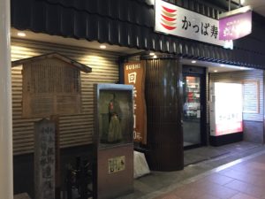 龍馬が盟友中岡慎太郎とともに討たれた京都の近江屋。現在はその跡地に、某大手回転寿司チェーンの店舗が建っています。