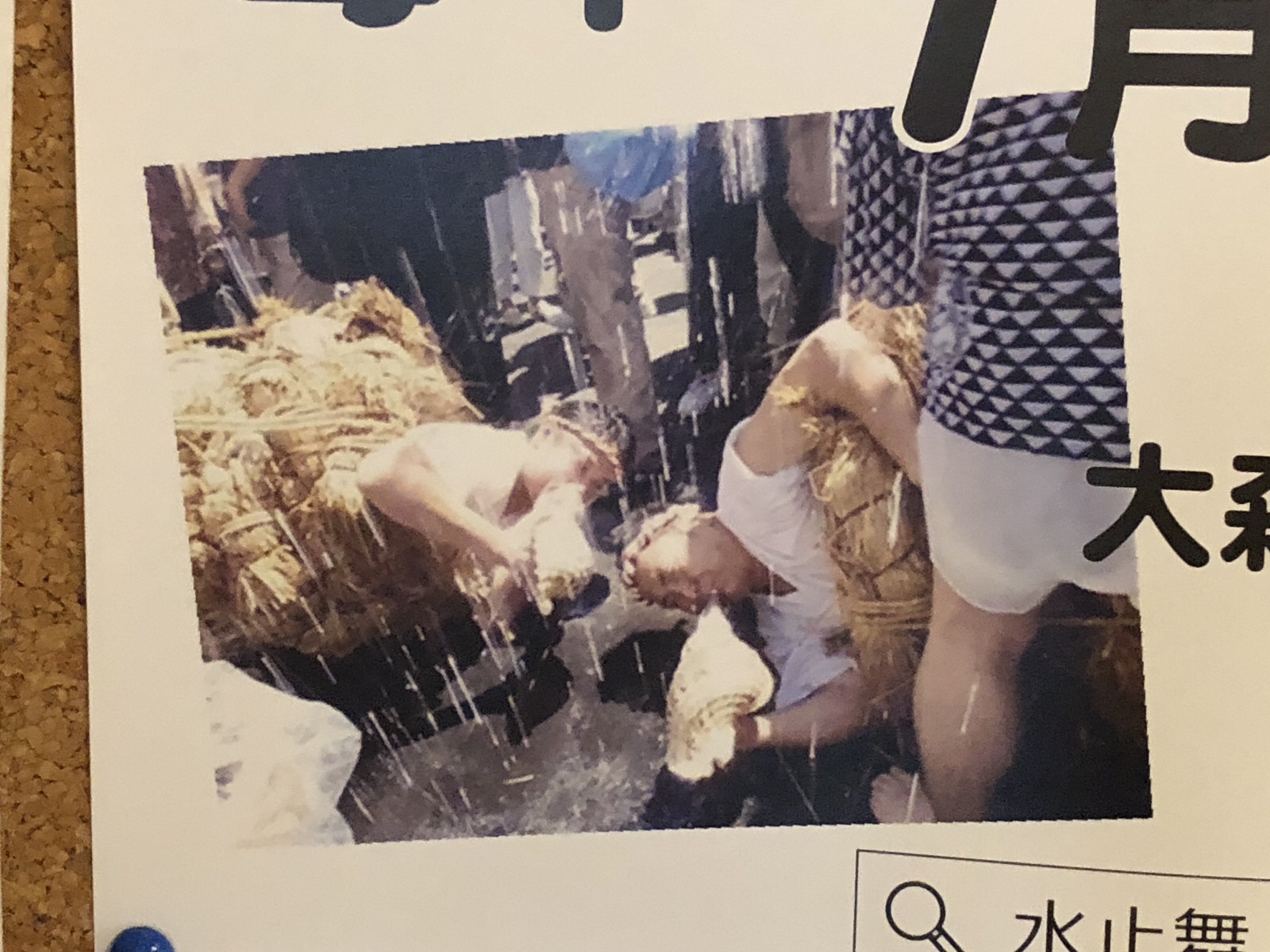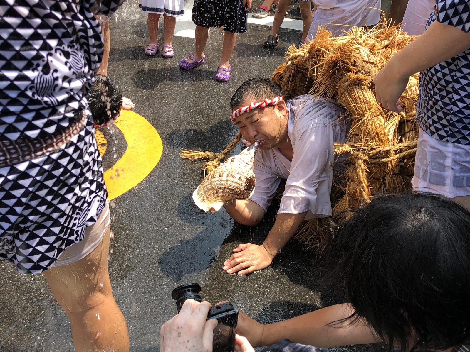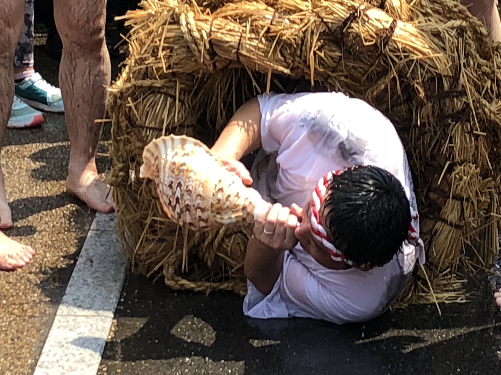 このす巻きの男は、龍神役です。彼らは水をかけられるたび、喜びの証として(?)法螺貝を吹きます。