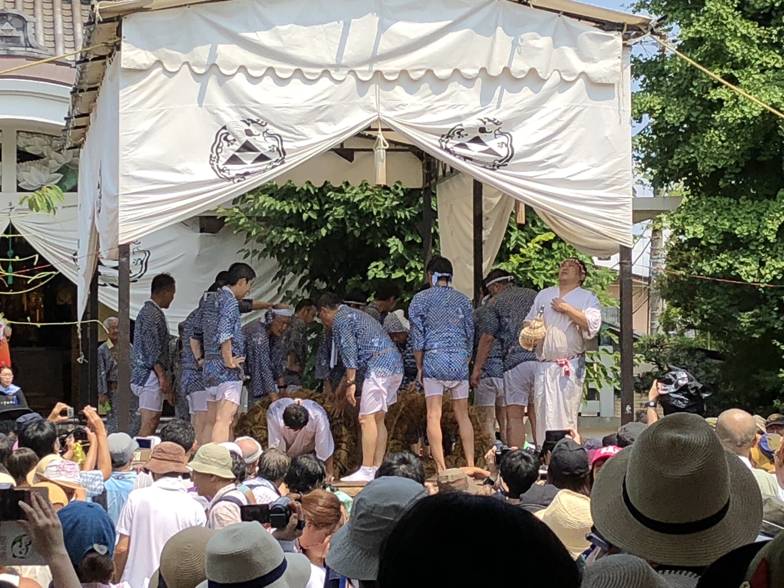 さて、す巻きの龍神は、「道行」の役目を終えると、境内の設営された舞台で藁縄を解かれます。