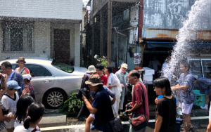 人だかりができている先に、青空に向かって撒きあがる大量の水。
