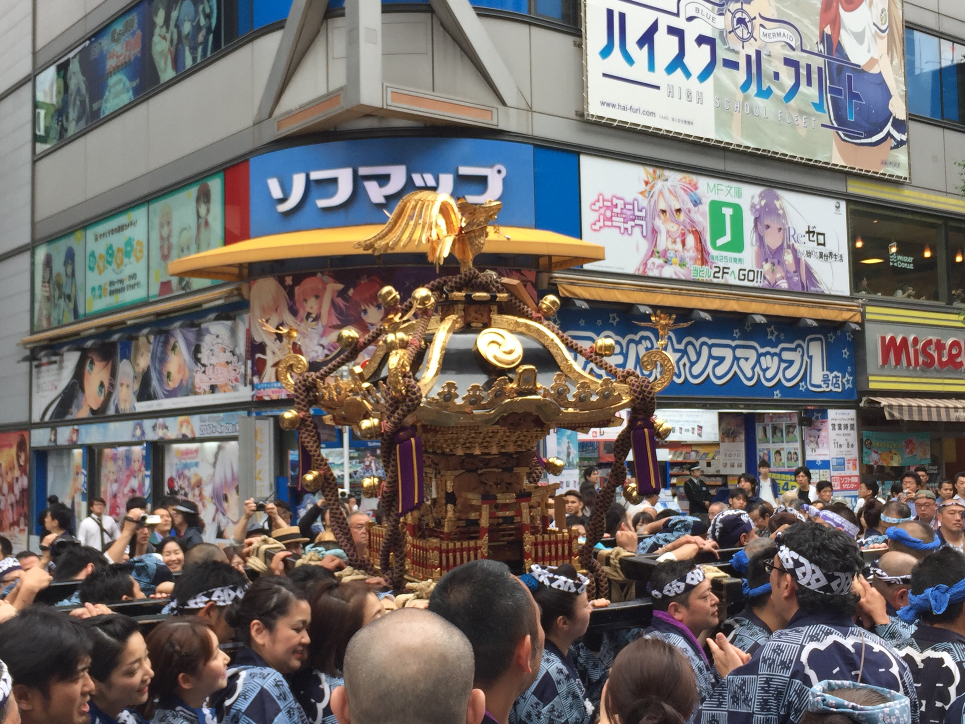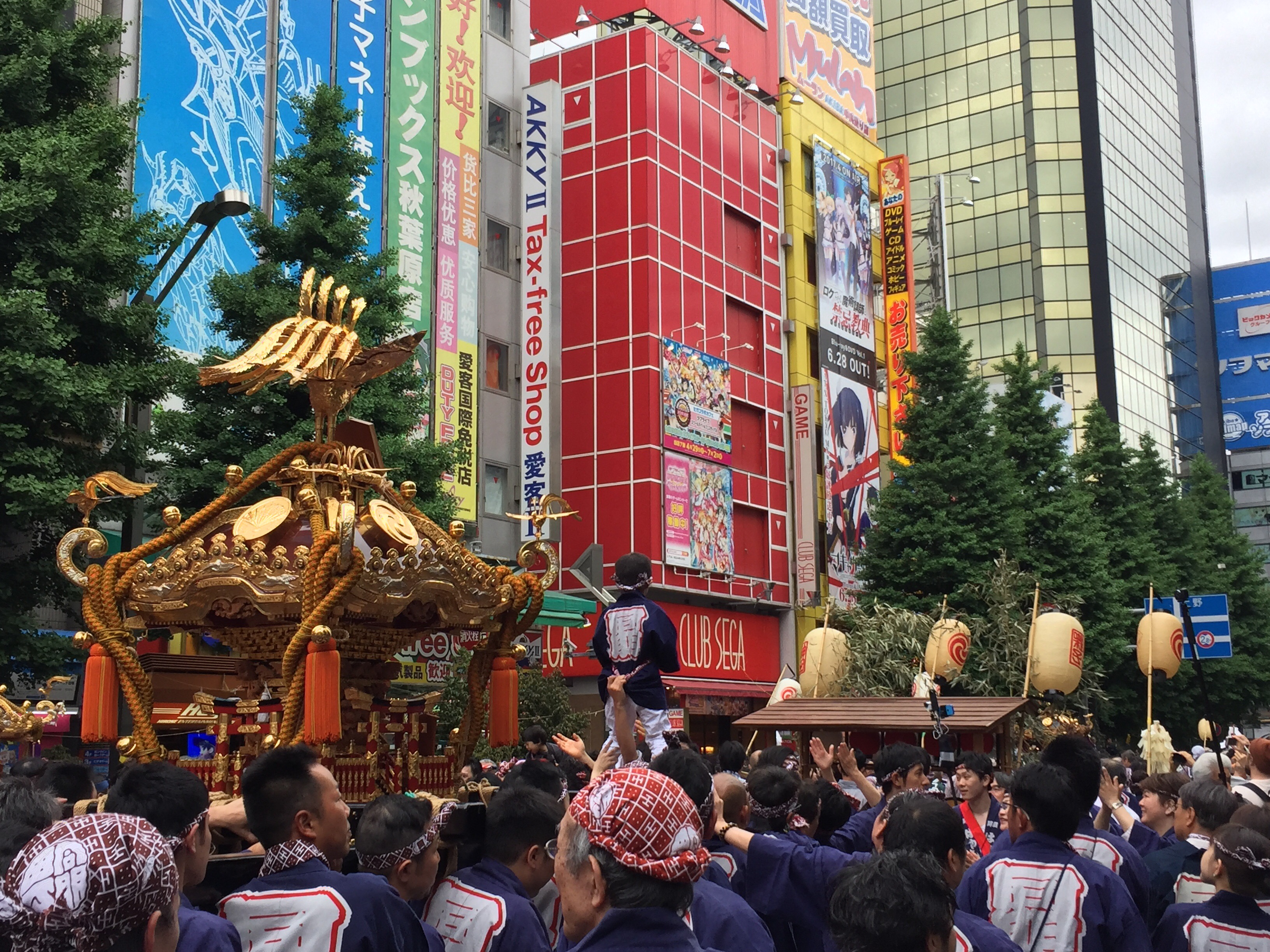 世界に誇る電気街を練り歩く、江戸の神輿とハッピ姿の町の衆。